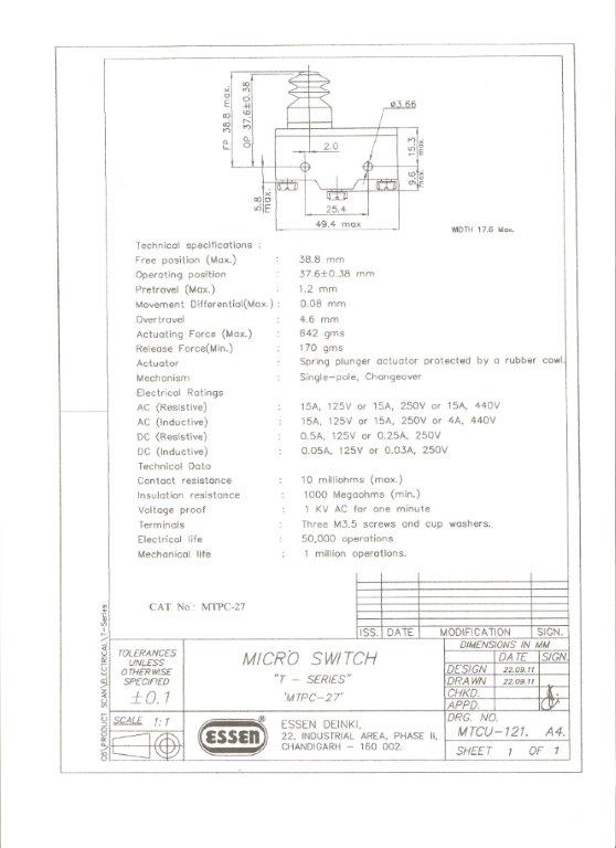 Essen Deinki 15a Microswitch with cowled plunger.