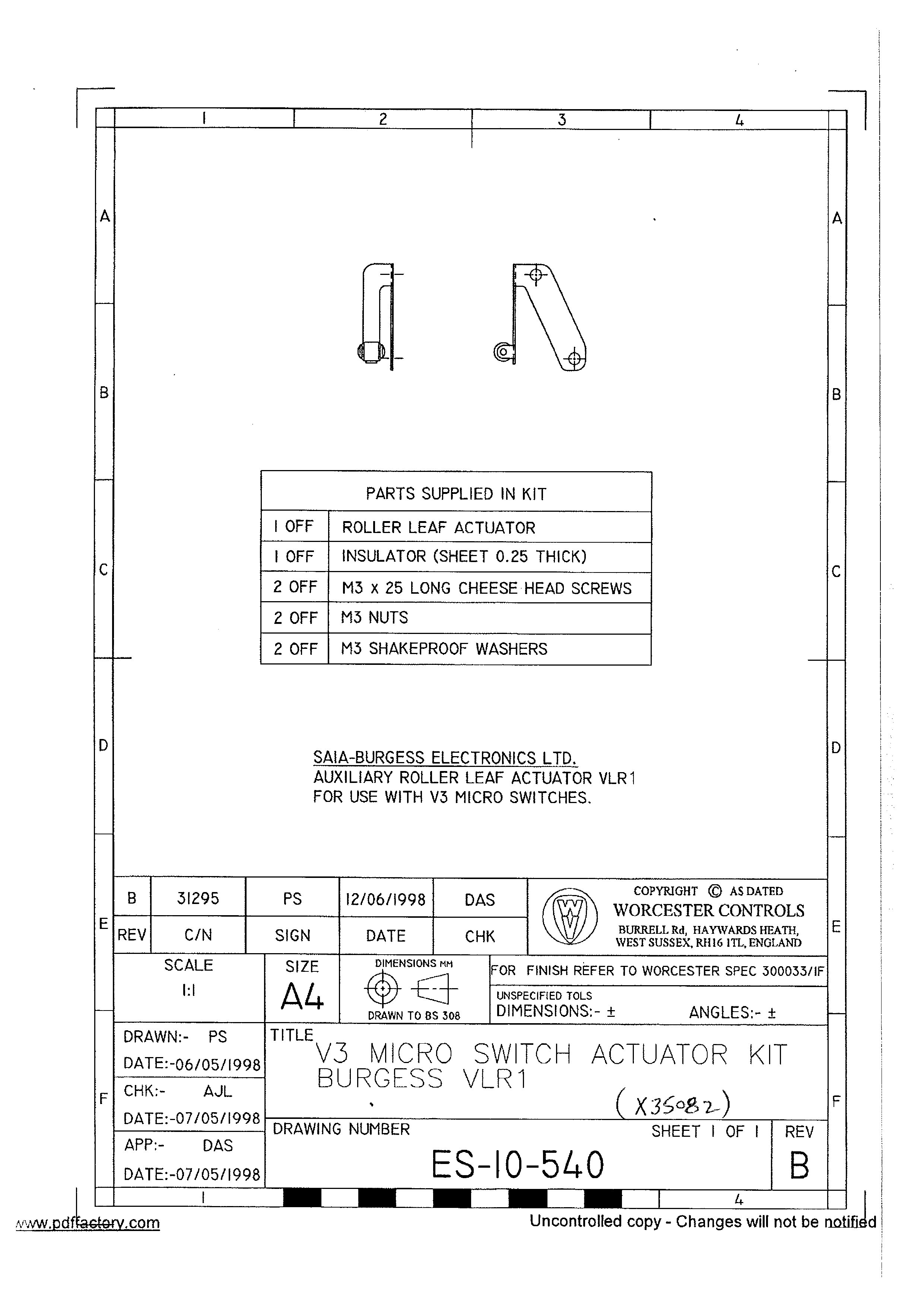 Saia-Burgess flexing leaf actuator with free-running roller, to fit one switch. Now OBSOLETE.